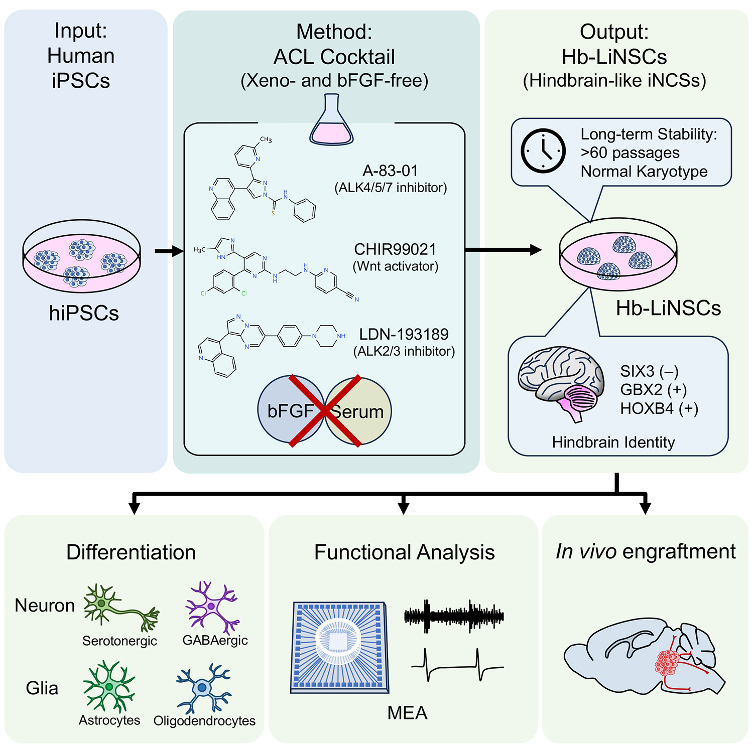 Neurons acquire distinct regional identities during development, and these identities are tightly linked to their functions and disease vulnerabilities. While neural stem cells (NSCs) derived from pluripotent stem cells are widely used in neuroscience research, preserving a stable, region-specific identity over long-term culture has remained a major challenge. To overcome these limitations, the research team devised a streamlined protocol to produce hindbrain-like induced neural stem cells (Hb LiNSCs) under minimal and defined conditions.