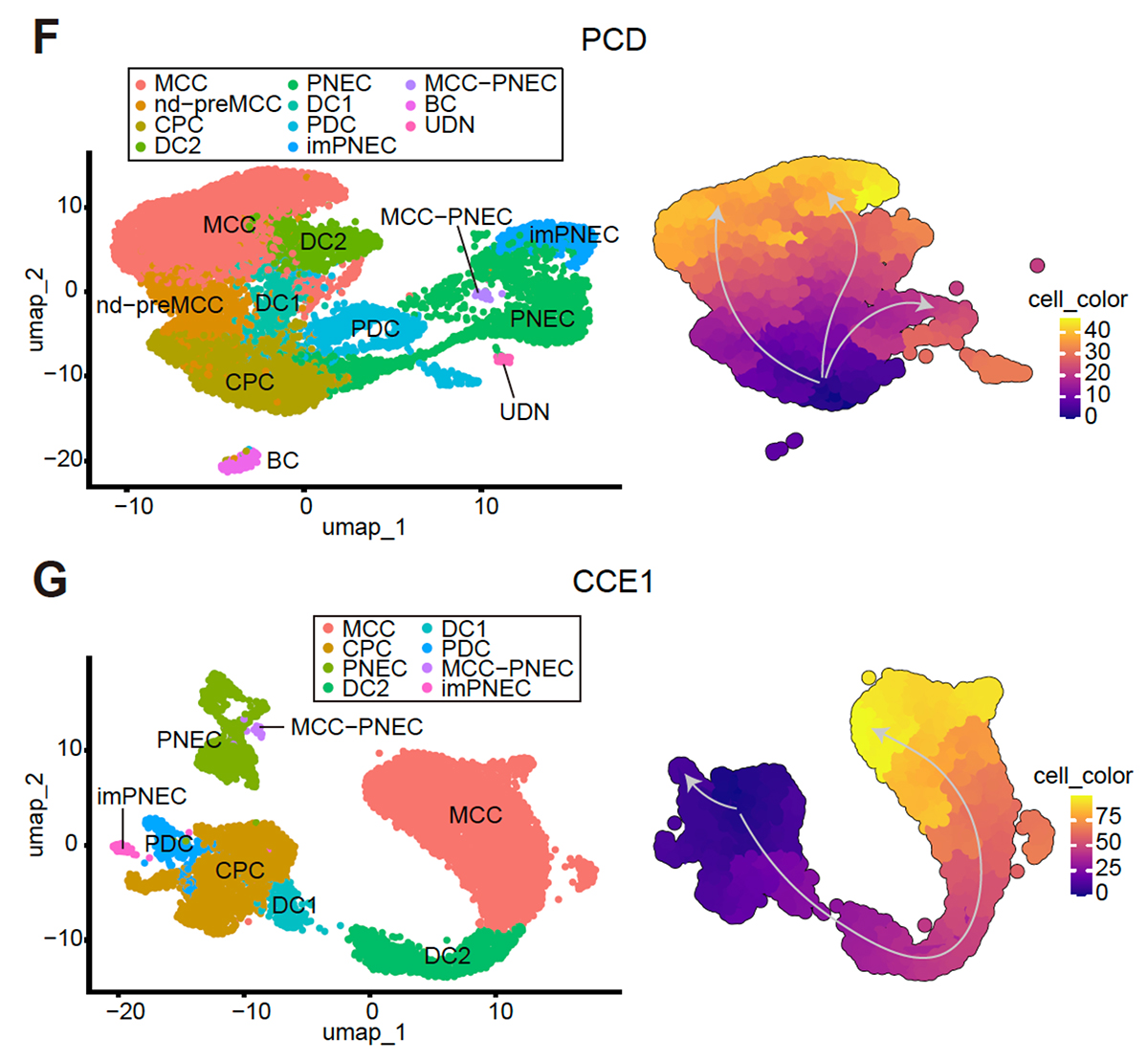 Fig. 3 PCD患者さん由来iPS細胞から分化させた気道上皮細胞(PCD-iAEC)とコントロールiPS細胞由来気道上皮細胞(CCE1-iAEC)のscRNA-seqに基づくUMAP解析・疑似時間解析の比較