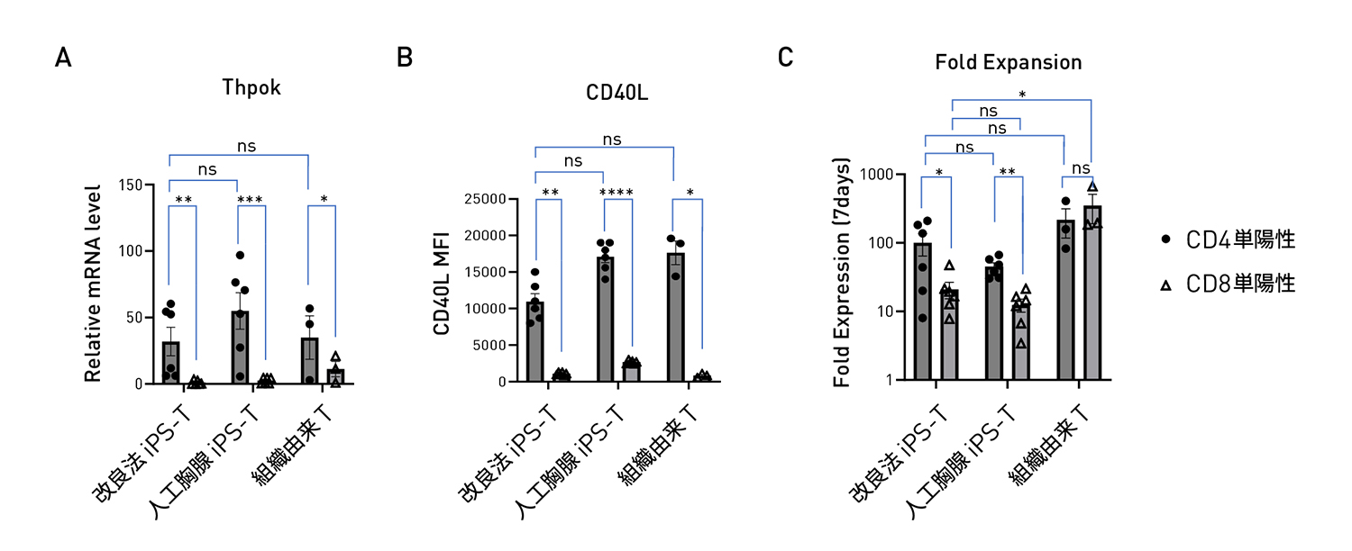 iPS細胞から改良法により誘導されたCD4+T細胞の性質を詳細に解析した結果、ヘルパーT細胞に必要な遺伝子群を調節するマスター遺伝子ThPOKを発現していました(図2A)。また、誘導されたCD4+T細胞の表面には、ヘルパー機能の役割に重要な「CD40L(CD40リガンド)」が高発現していることが確認されました(図2B)。