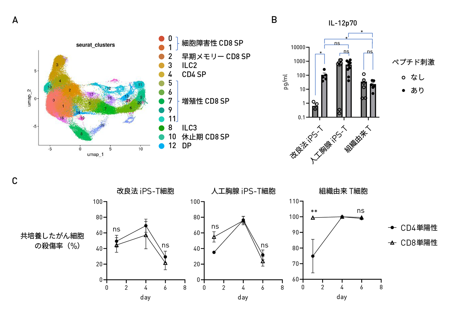 臨床応用を見据えた機能評価においては、改良法によって誘導された細胞が、がんの目印(ペプチド)に反応して、免疫の起点となる「樹状細胞」の成熟を誘導するかを検討しました。その結果、樹状細胞の成熟の指標となる「IL12(インターロイキン12)」の分泌を確認しました(図3B)。検証の結果、体内の免疫系を動員するヘルパー機能が十分に備わっていることが示されました。
