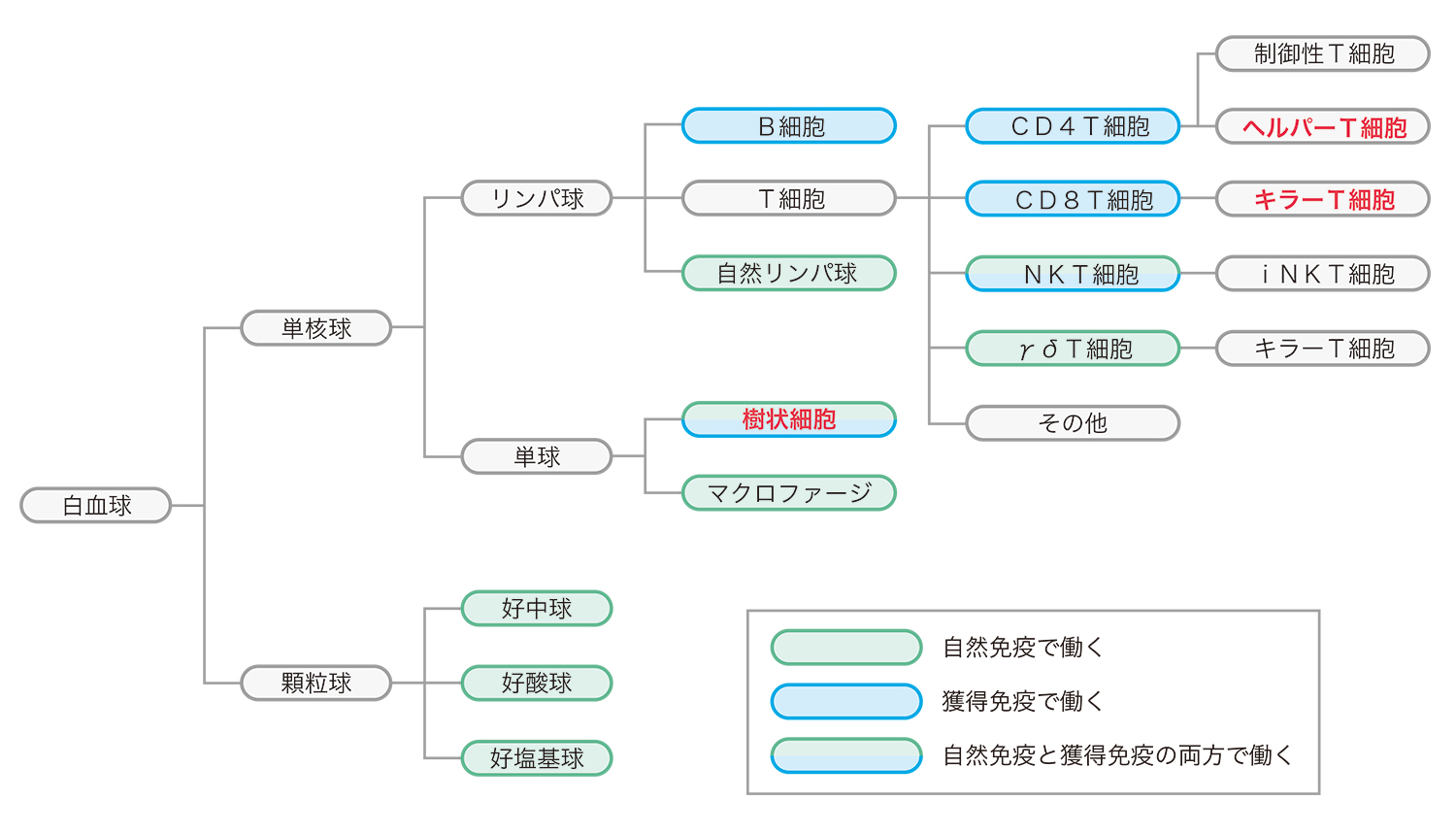 免疫においてはたらく細胞の一種。他の免疫細胞から抗原の情報を受け取ると、その抗原に対応するキラーT細胞が活性化し、異物を攻撃して分解する。