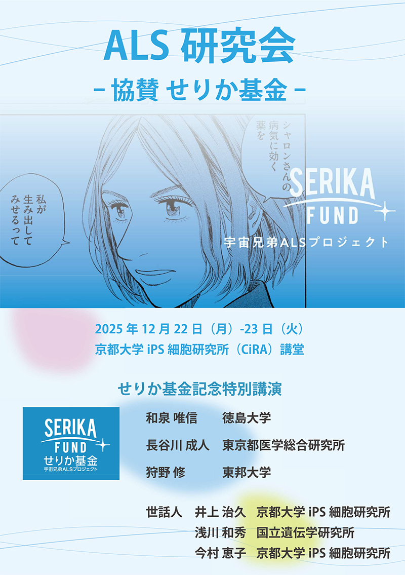 人気漫画『宇宙兄弟』(著:小山宙哉)から生まれた、ALSの治療法開発を支援するチャリティプロジェクトです。作中の登場人物・伊東せりかが、ALSで亡くした父のために治療法を見つけようと医師、そして宇宙飛行士を目指すストーリーにちなみ設立されました。「個人の願いが集まれば、病気をなくすことができる」という想いのもと、集められた寄付金はALSの治療薬開発に取り組む研究者への助成金「せりか基金賞」として活用されています。CiRA井上治久教授は「せりか基金賞」の審査委員長を務めています。